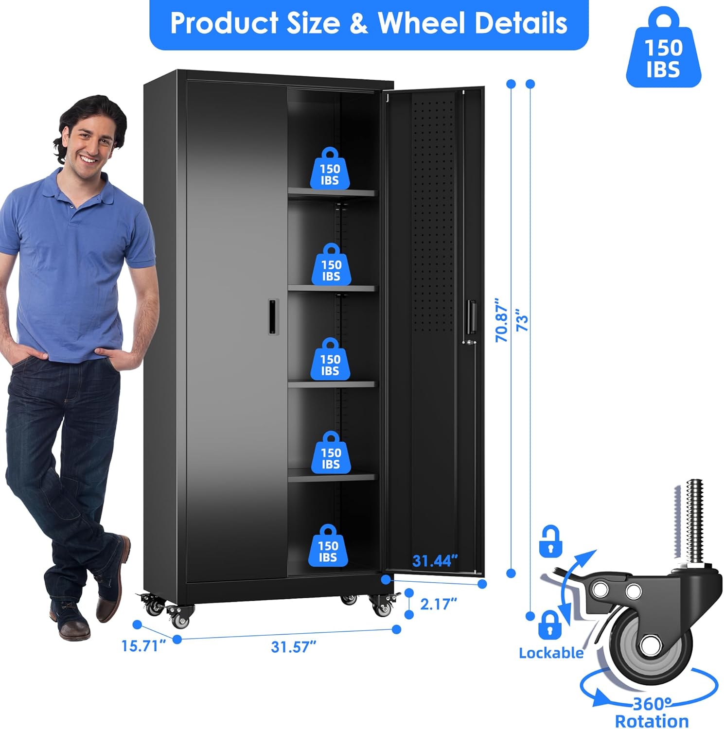 - 【Utility Pegboard & Adjustable Shelves 】Redesign your organizing ways, hang up everything on the door, get effortless accessible for a variety of small hardware, no more searching for things among the clutter. Tall Garage storage cabinet with wheels is designed with 4 adjustable shelves, you can easily meet your different storage needs by adjusting the height between the shelves.Each shelf of the storage cabinet on wheels can hold up to 150lbs