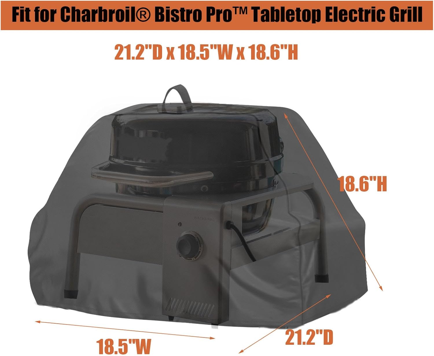 - Grill Cover Size: 21.2"D x 18.5"W x 18.6"H. Compatible for Charbroil Bistro pro tabletop electric grill, or orther grill of the same size.Please check your grill's dimensions