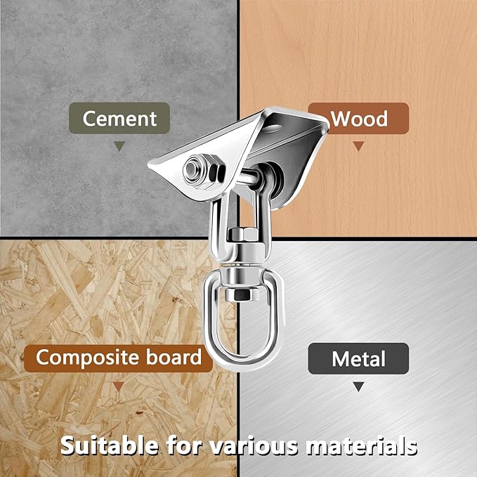 - Widely Used in Wood and Concrete: Our swing hardware provides 2 screws for wood and 2 expansion bolt for concrete. Heavy duty hammock hanging kit for ceiling, punching bag, porch swing, hammock, swing chair, ring, yoga swing, boxing equipment, hammocks, chairs, beds, baskets, furniture, swings, hammock hanging kit, hammock chair hanging kit, porch swing hanging kit, hanging chair hardware.