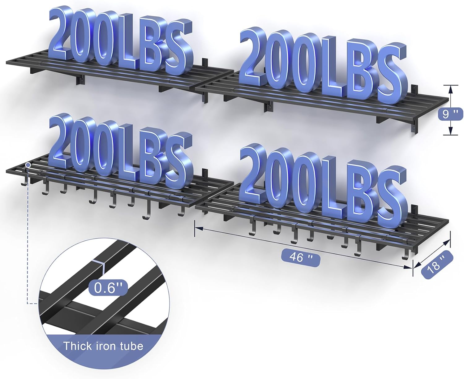 - HEAVY-DUTY GARAGE SHELVING: Our 4-Pack wall-mounted shelves provide generous storage, featuring two 1.5'x4' shelves per unit. Built from heavy-duty steel, each shelf holds up to 200 lbs, offering a combined capacity of 800 lbs. Ideal for garages, warehouses, offices, and beyond, these shelves are designed for durability, stability, and efficient space organization