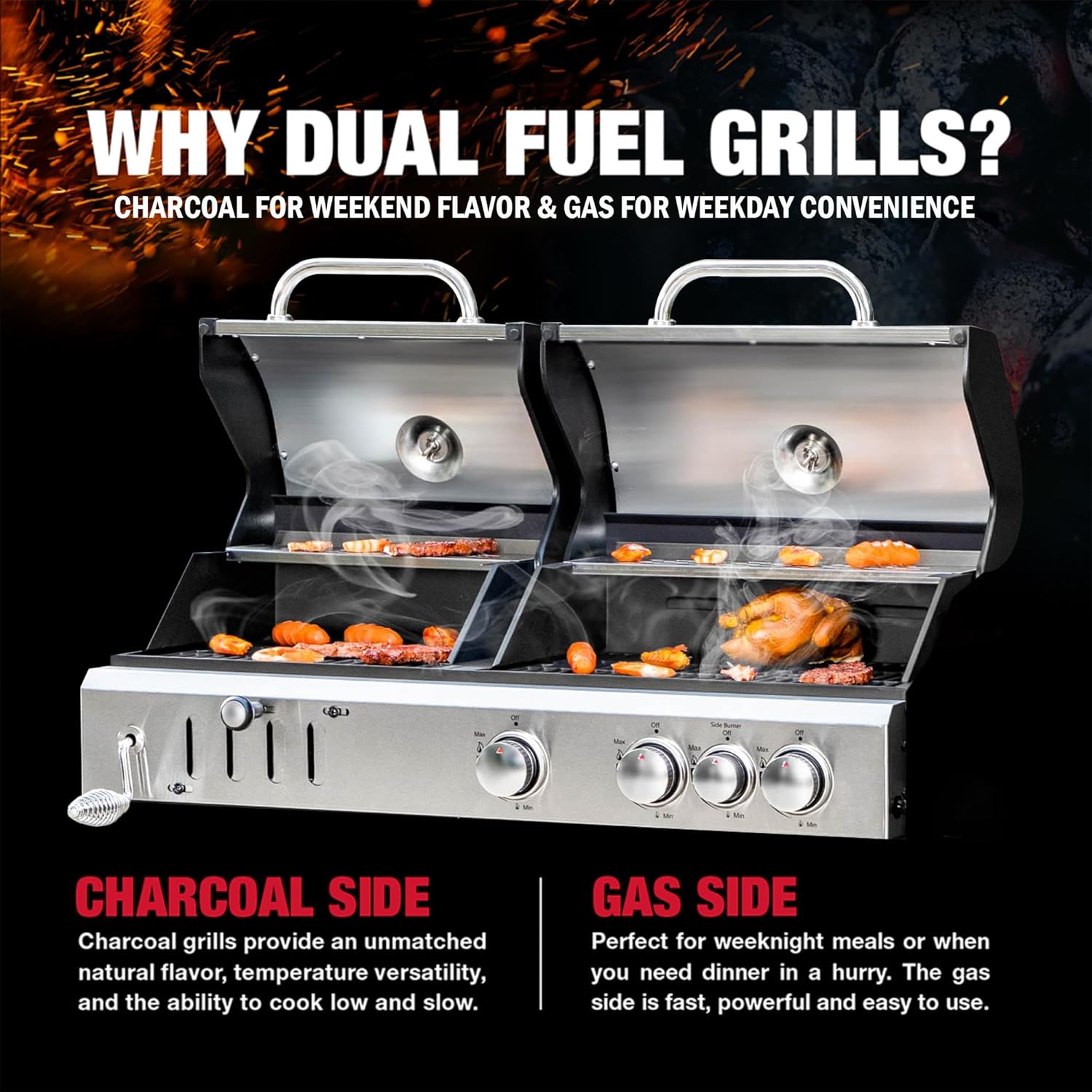 - COMBO GRILL: Gas and charcoal comb grill with additional side burner for ultimate cooking versatility. Can give you the rich, smoky flavor of charcoal or wood and the speedy convenience of gas in one tidy package. This dual fuel grill is a great option if you want to grill like a pro but can’t decide between a charcoal and a gas grill. You'll also conserve space on your porch or patio with one grill instead of two