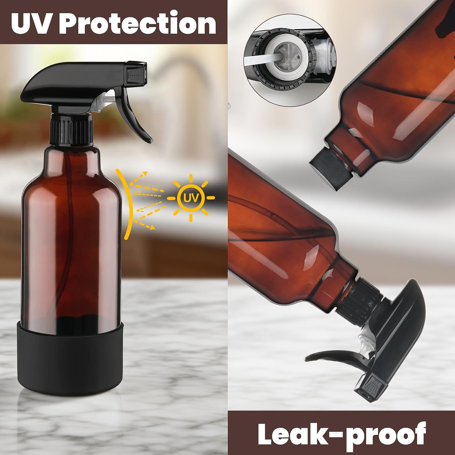 - Amber bottle: Our spray cleaning bottles are dark brown to prevent UV degradation, ensuring the safety of your essential oils. The included silicone sleeve minimizes the risk of breakage and slipping, making it safe for daily use