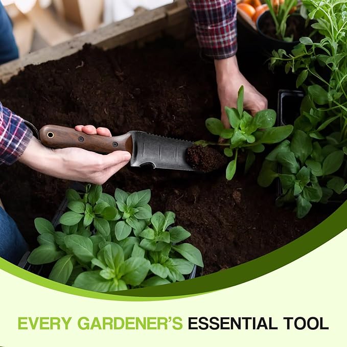- MULTIFUNCTION BLADE GARDEN KNIFE​: This garden knife is equipped with a sharp straight edge and a serrated edge. The straight edge is ideal for daily cutting, while the serrated edge can easily handle tough roots and stems. The blade is marked with inch measurements, enabling precise control of planting depth. The cord-cutting edge can also double as a bottle opener. With its walnut wood handle and practical blade, it is a reliable tool for both outdoor activities and gardening work