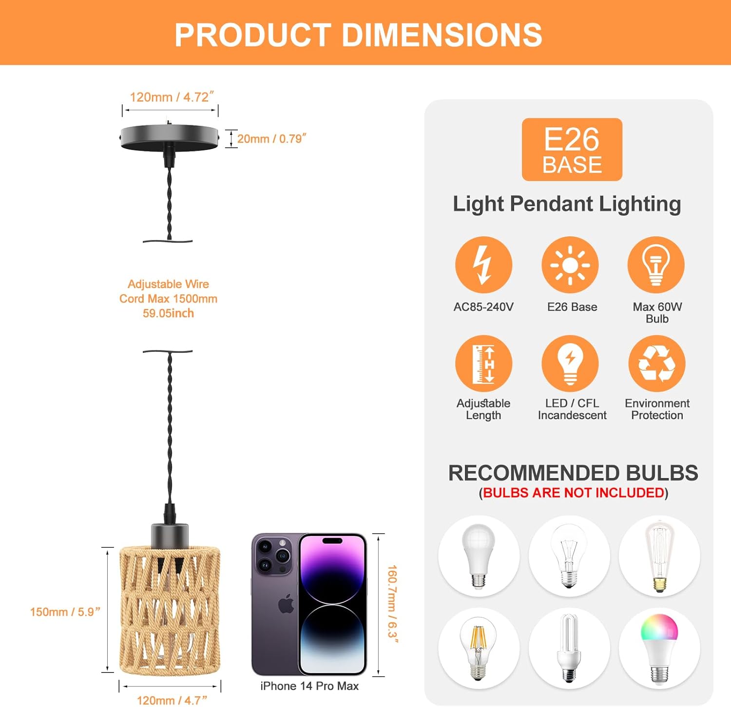 - 📏 【Adjustable Height & Versatile Placement】The rattan light fixture has a 4.7-inch diameter shade with an adjustable cord (9.8"–71"),fitting both flat and sloped ceilings.Perfect for hallways,entryways,living rooms,bedrooms,porches,kitchens,and dining areas,this wicker pendant light becomes a stylish focal point in any room.