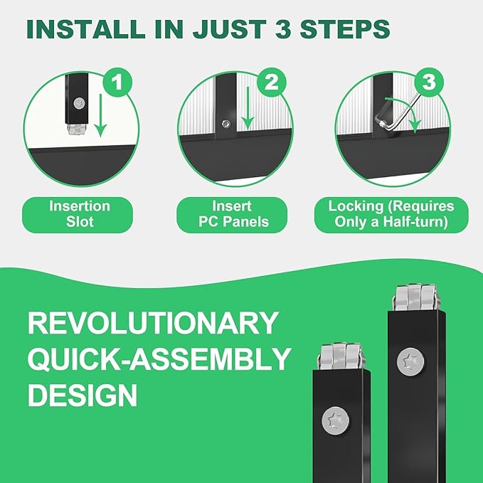 - Roof Vents & Gutter System: The outdoor greenhouse is equipped with an adjustable roof vent. During installation, you can position it on any panel and customize its location according to your needs. In addition, the greenhouse is furnished with a gutter system for collecting rainwater. This practical and eco-friendly design adds convenience to your garden. Moreover, the polycarbonate greenhouse comes with a secure lockable door, which can effectively resist the impact of wind