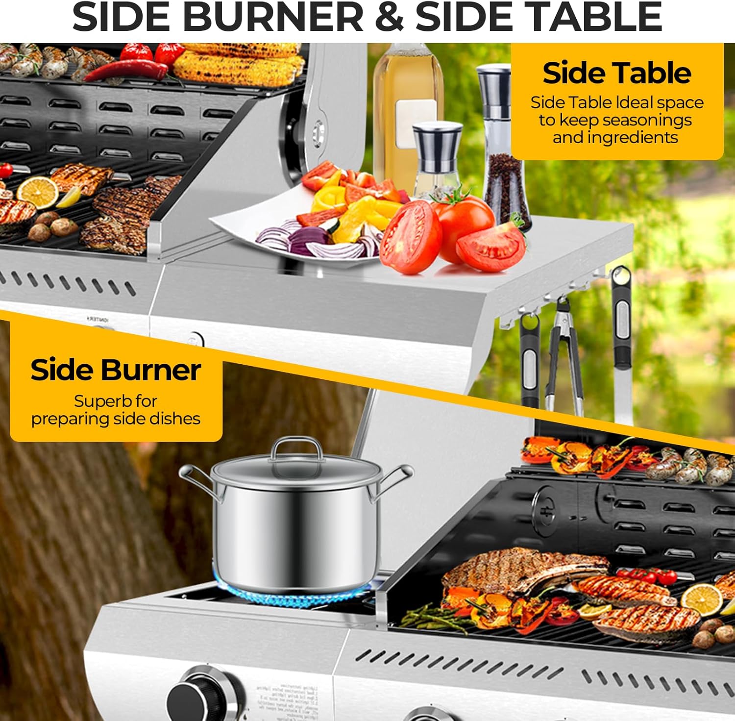 - Spacious Cooking Area & Storage : Offers 489.17 sq. in. total grill space (358.95 sq. in. main grilling + 130.22 sq. in. warming area). Built-in bottle opener, side hooks for tools, and bottom storage keep everything organized.