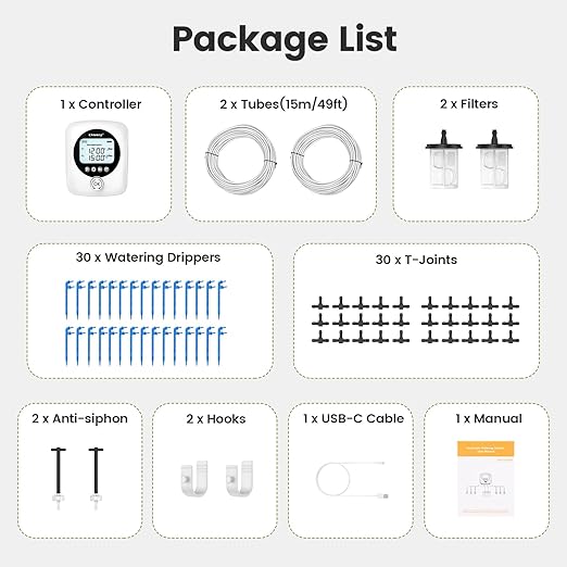 - What You'll Get: Chtoocy automatic plant waterer includes control x 1, water tubes (15m each one) x 2 , drippers x 30, T- joints x 30, filters x 2 , anti-siphon components x 2, hooks x 2, USB-C cable x 1 and manual x 1