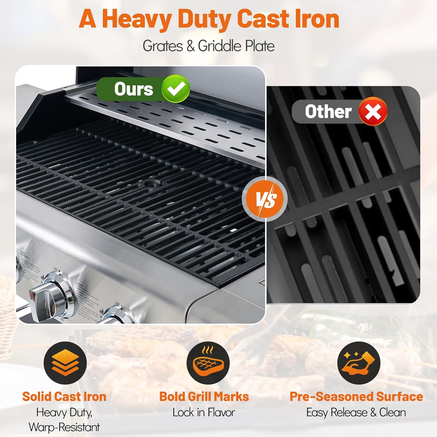 - Outdoor-Ready Durability: Crafted from high-temperature powder-coated steel and porcelain-coated cooking grates, this stainless steel gas grill resists rust, peeling, and flare-ups—ensuring long-term performance in outdoor environments
