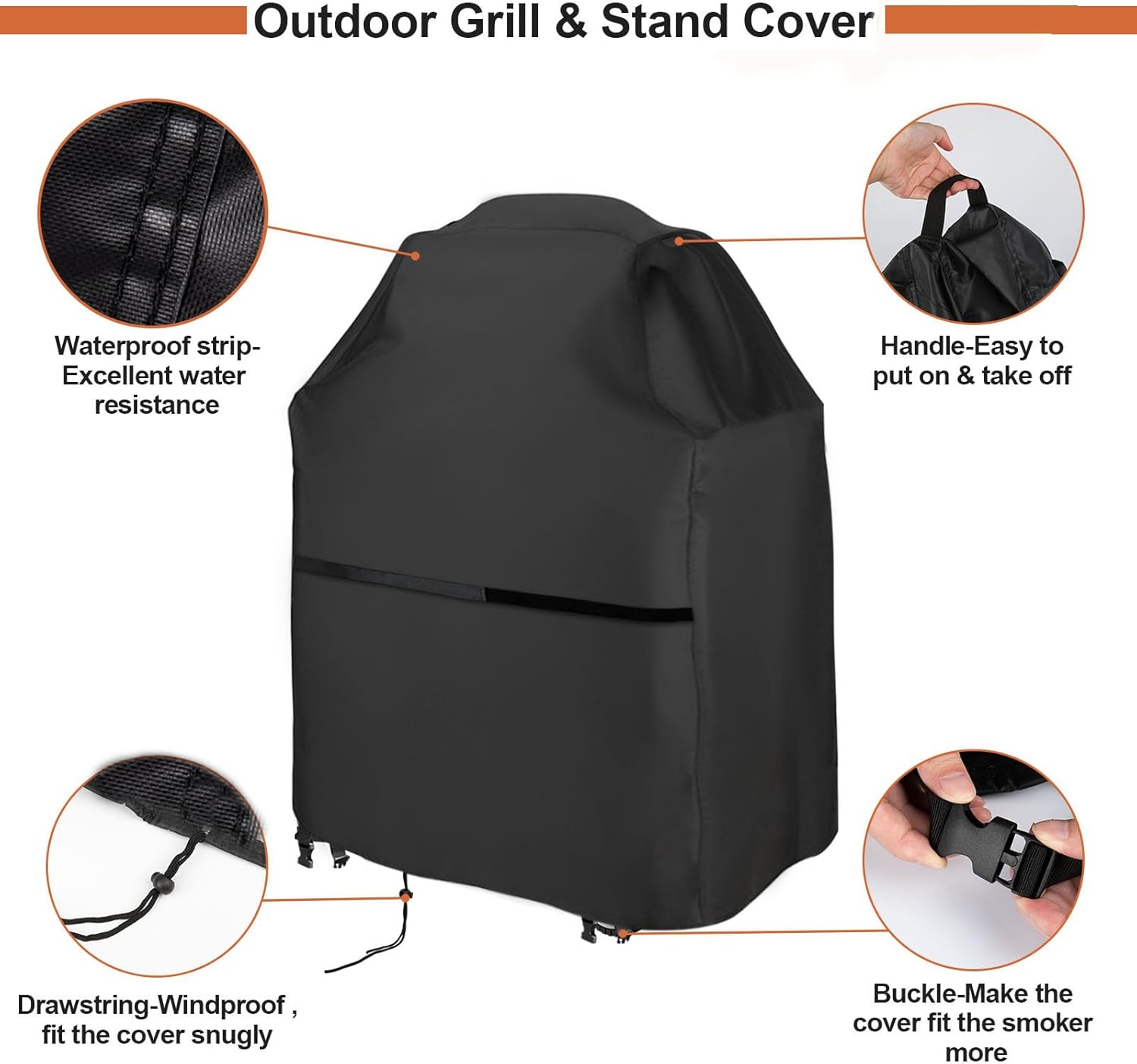 - Wind-proof & Stable Design: Unique fit cut, elasticated drawstring at the bottom, Velcro at the side, windproof buckle straps, can be easily tightened and fixed to the base of the grill to ensure that the cover is not easy to be blown over or shifted in high winds, and guard your grill tightly