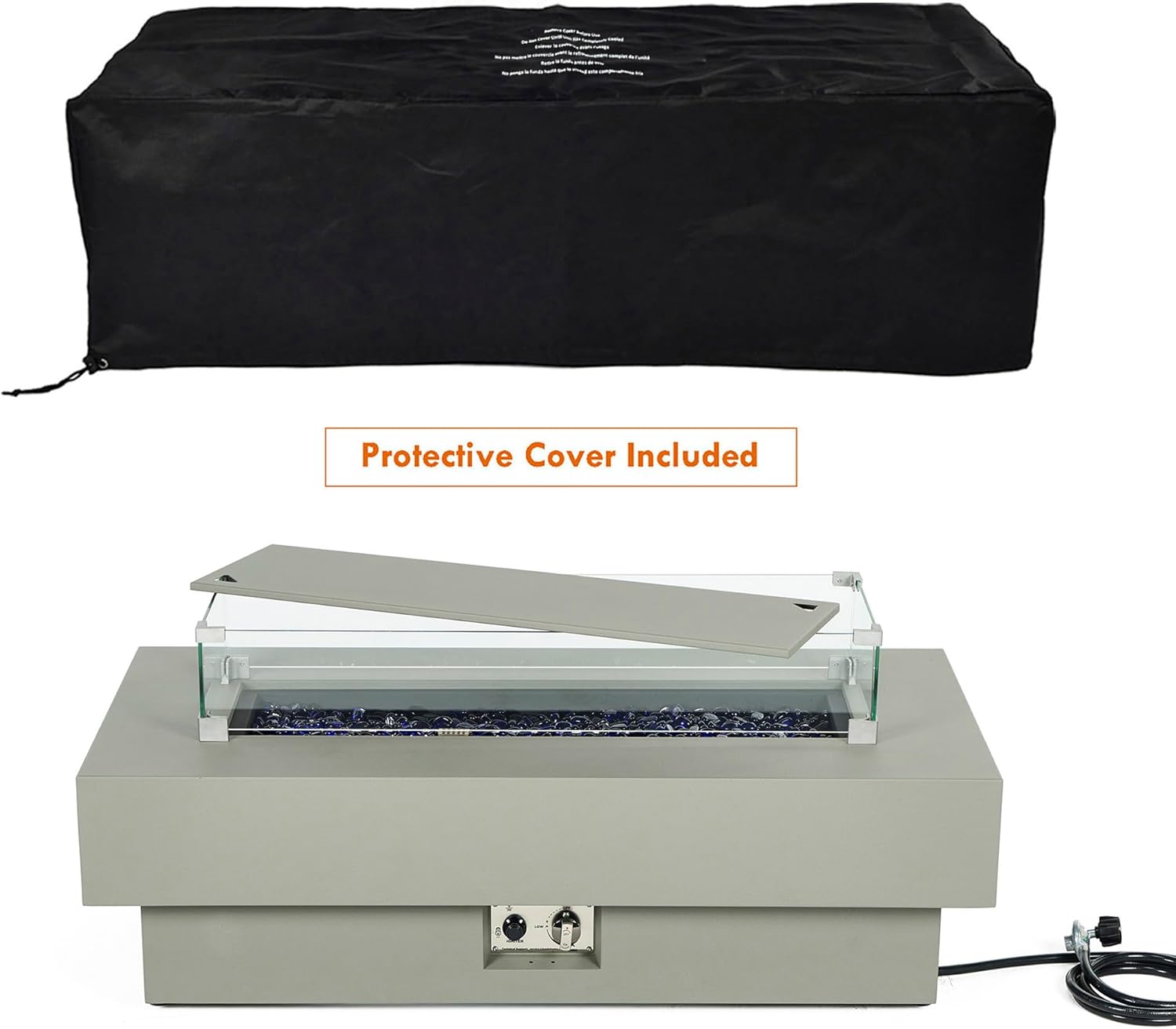 48-inch Fire Table with 20lb Propane Tank Cover & Wind Glass Shield, 50,000BTU Outdoor Modern Patio Fire Pit Table w/Rectangular Burner Lid, Glass Rocks, Pre-Attached 10ft External Gas Hose