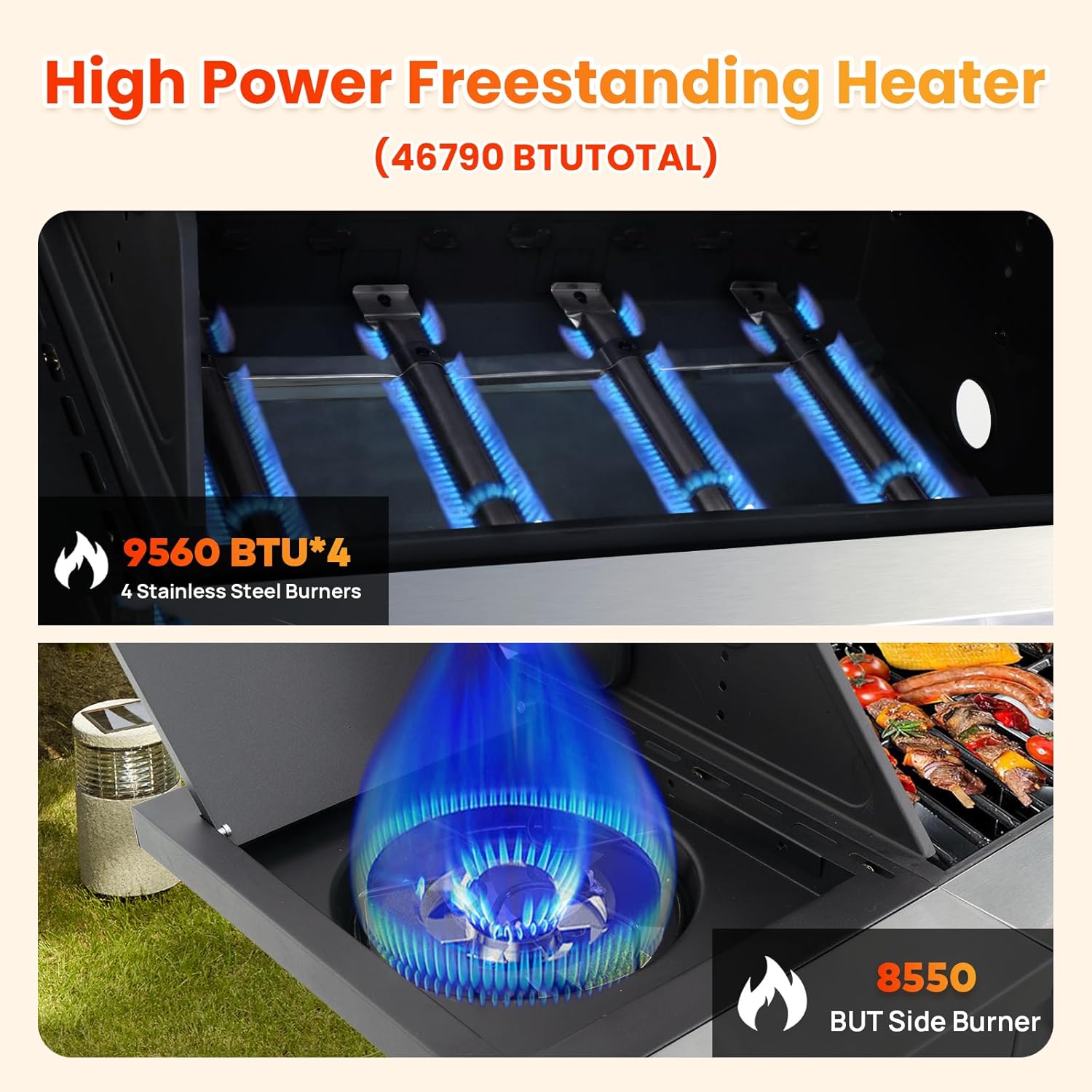 - 🔥 High-Performance Stainless Steel Burners - This propane gas grill features 4 powerful stainless steel burners and side burner delivering a total of 46,790 BTU per hour. With a built-in piezoelectric ignition system, you can enjoy instant start-up—just push and turn the control knob. It’s reliable, efficient, and ready to fire up your outdoor meals in seconds.